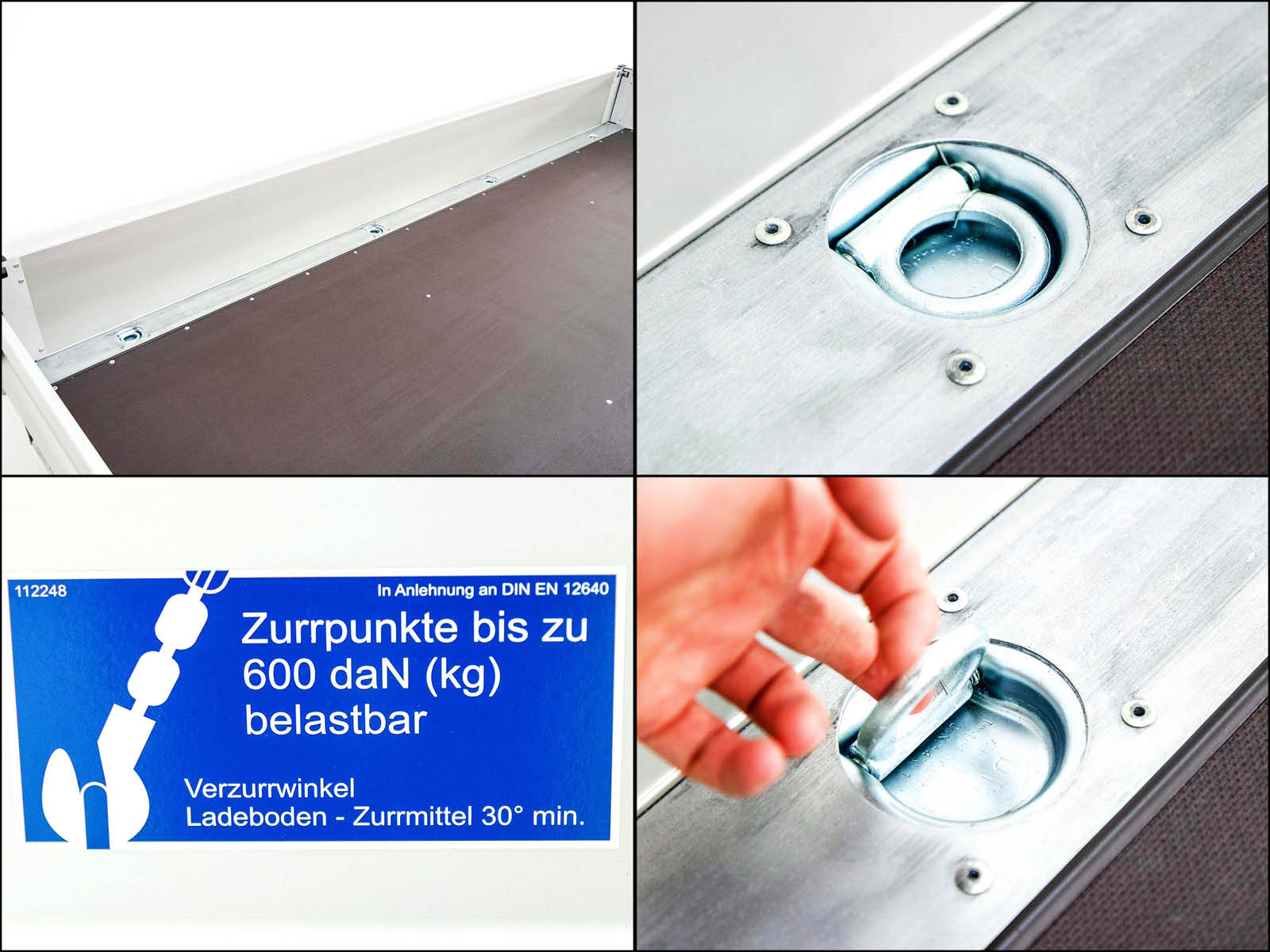 - 8 Zurrmulden klappbar, im Bodenrahmenprofil versenkt montiert jeweils belastbar mit bis zu 600 daN, Dekra zertifiziert