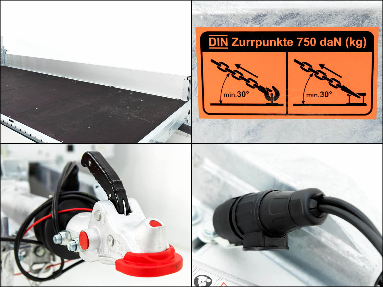 - Zurrbügel: 10 Stück im Bodenrahmenprofil, gummiert 500 daN (kg)