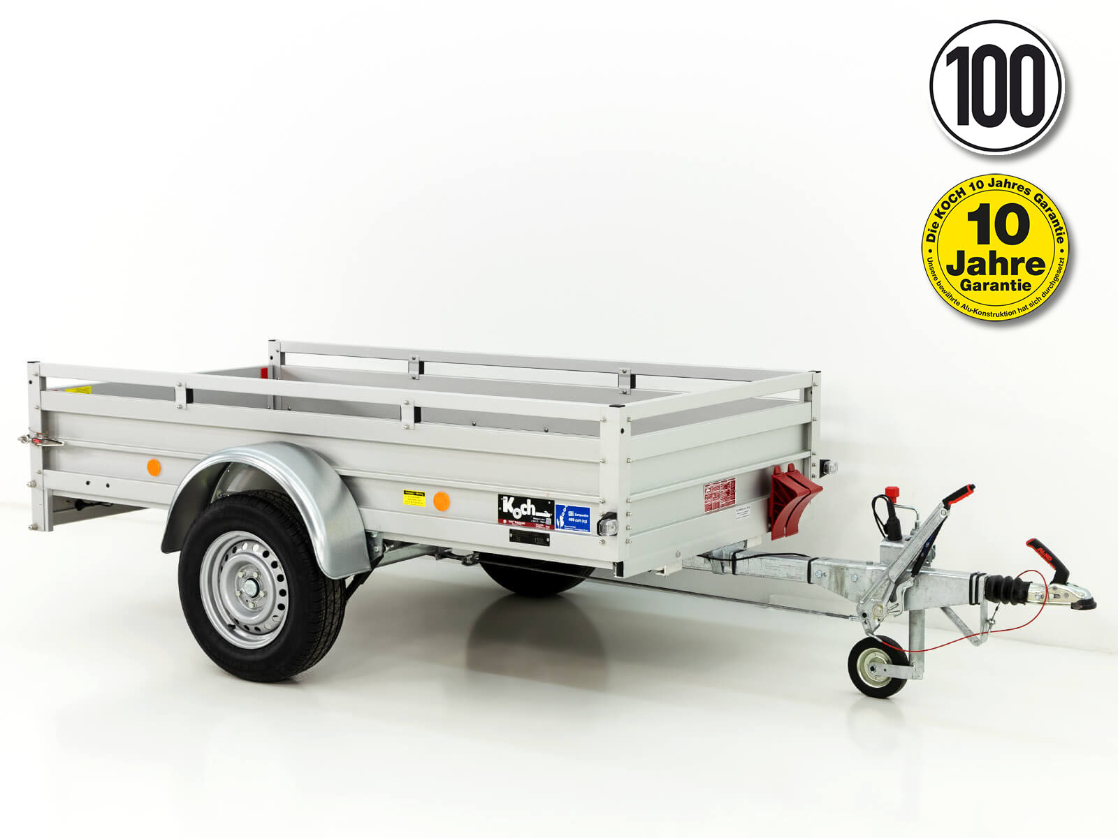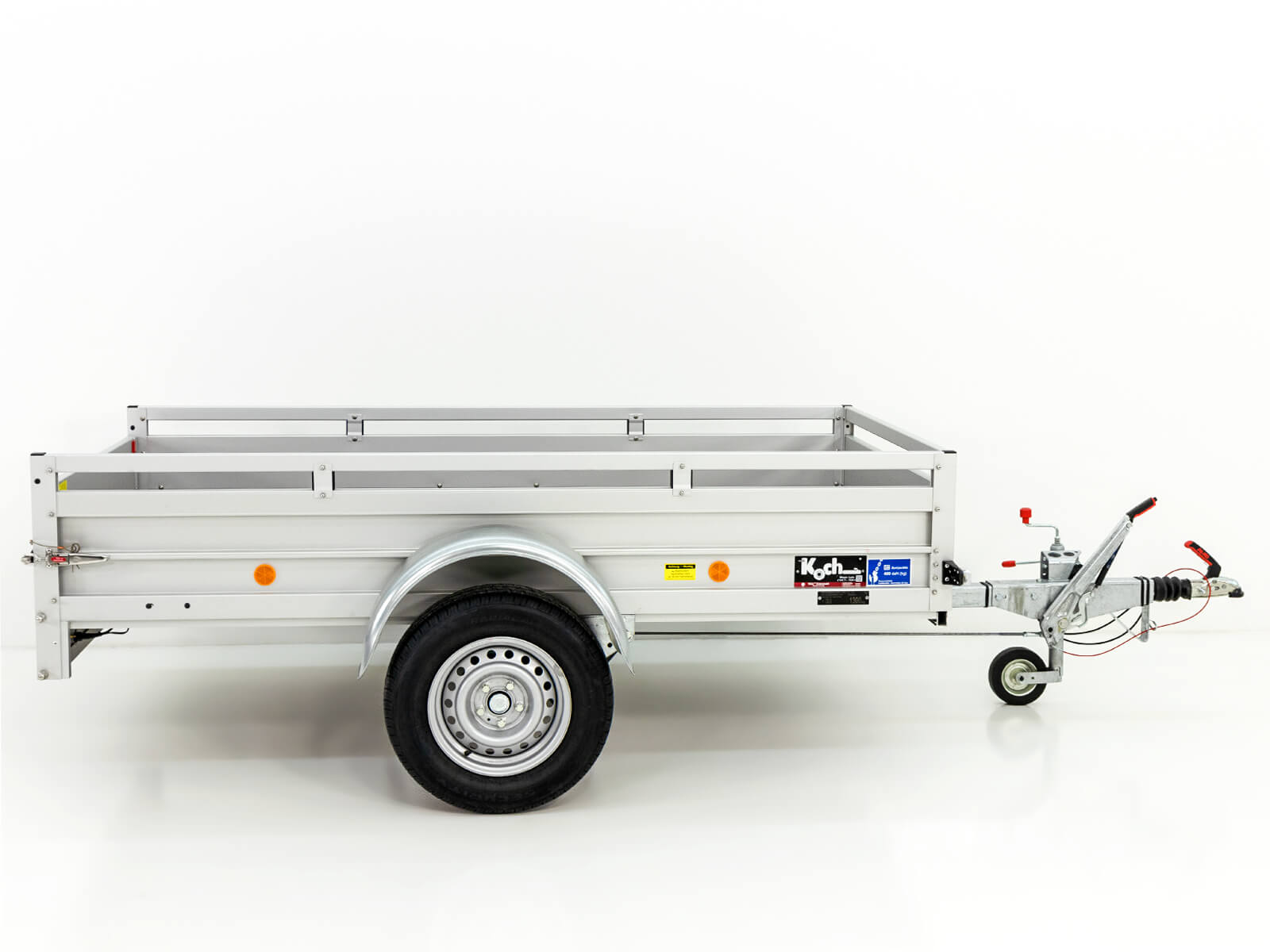 PKW-Anhänger Typ 4.13 mit einem Lademaß 125 x 250 x 45cm. Leichter Aluminium-Anhänger mit zuläßigem Gesamtgewicht von 1300kg und einer Nutzlast von 1060kg inklusive 10 Jahren Garantie. Koch-Anhängerwerke fertigt seit über 30 Jahren Qualitätsanhänger made in Germany.