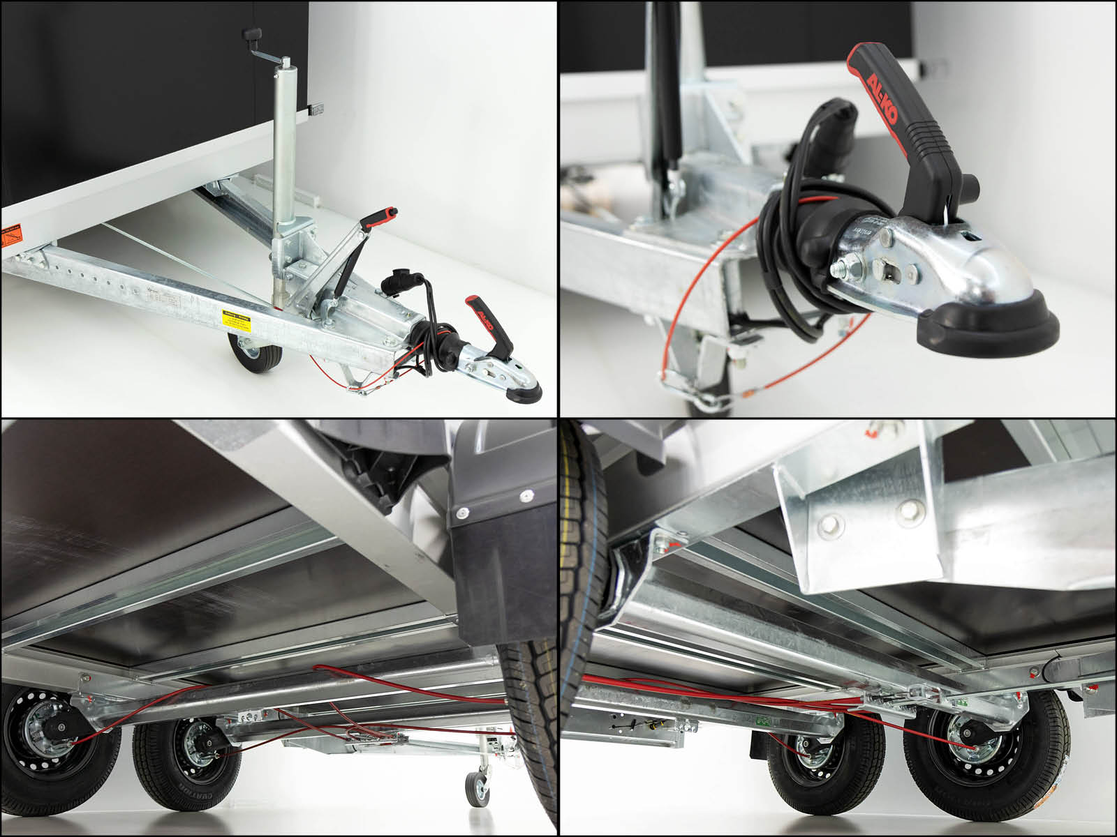 - Achse u. Zugrohr komplett feuerverzinkt | Gummifederachse | Einzelradaufhängung | V-Deichsel mit Zugkugelkupplung | Rückfahrautomatik | Automatik-Schwerlaststützrad
